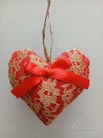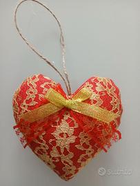 Cuori da appendere, uno grande e uno piccolo, in tessuto rosso con pizzo oro decorati con fiocchi.