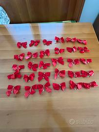 Decorazioni natalizie rosse. 5 palline rosse con brillantini a formare righe in oro + 4 palline rosse con stelline oro, puntale rosso per cima albero, decorazioni natalizie ( pacchi , pigne , palline ) più ulteriore confezione di palline rosse , 30 fiocchetti rossi , 6 catene di 2 metri o poco più x ognuna + ulteriore catena rossa in rocchetto di circa 10 metri.