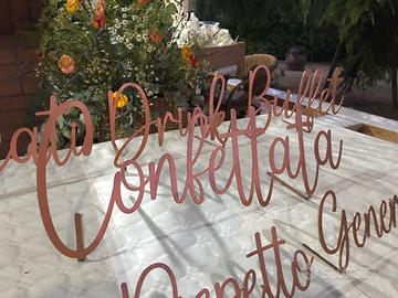 14 nomi per tavoli matrimonio + 7 scritte, tutte in lamiera tagliata a laser, piegata e verniciata in color oro.
