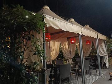 Vendesi struttura professionale per dehor esterno, dimensioni 6 metri x 2 metri, ideale per attività commerciali o ampi spazi privati. Design elegante a tre punte (stile pagoda), robusto e di grande impatto estetico.