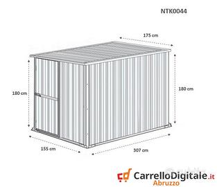 * Dimensioni esterne (incluso tetto): 1.75 m (Larghezza) x 3.07 m (Lunghezza) x