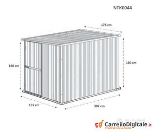 * Dimensioni esterne (incluso tetto): 1.75 m (Larghezza) x 3.07 m (Lunghezza) x