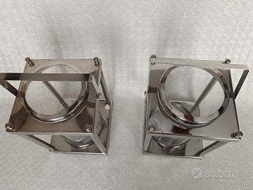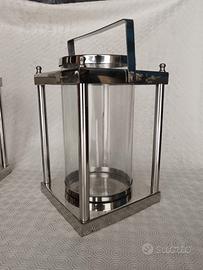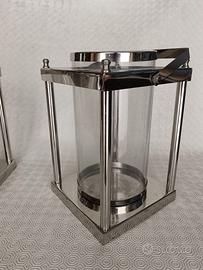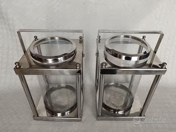 Due eleganti, grandi portacandele in acciaio e vetro, molto ben conservate, ideali per ambienti di design, ristoranti o catering. Tracce di sporco rimuovibili. Conservazione ottima. Misure: 23 x 23 x H.33 cm È richiesto unicamente il ritiro. Non si vendono separatamente. Grazie