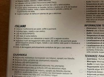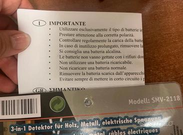 Detector multifunzionale 3 in 1 per legno, metallo e tensione elettrica. Triscanner modello SMV-2118. Comodo per lavoretti in casa, con indicazione a mezzo Led e segnale acustico. Evita di danneggiare condutture del gas o cavi elettrici. Istruzioni incluse all'interno. Prodotto nuovo, Batteria pila a blocco 9 V non inclusa. Possibilità di scambio a mano zona centro Milano oppure sera o weekend piazzale Martini.
