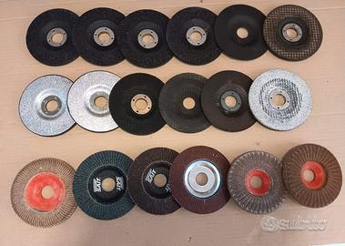 18 Dischi abrasivi per smerigliatrice angolare , 12 di tipo Standard e 6 di tipo lamellare, per ferro e pietra. Diametro 115 mm, foro 22 mm, spessore da 3 a 6.4mm, grana da 40 a 80.