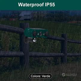 Dissuasore repellente, che funziona ad energia solare tramite il pannello solare e batteria ricaricabile integrati, resistente alle intemperie quindi può essere posizionato all'aperto anche sotto la pioggia, tramite un sensore di movimento quando rileva animali o persone in movimento in un raggio di azione di circa 10 metri emette flash LED lampeggianti rossi e blu e ultrasuoni, oppure suoni come sirene, ecc... che é possibile scegliere selezionandoli da un tasto a seconda di chi si vuole tenere lontano, che tengono lontani animali come: topi, cinghiali, lupi, orsi, scoiattoli, volpi, caprioli, lepri, cani, gatti, ecc... e anche ladri. È nuovo, completo di accessori per fissarlo piantato nel terreno oppure tramite supporto da tassellare a muro e orientabile a piacimento, oppure può essere appoggiato direttamente dove si preferisce.
