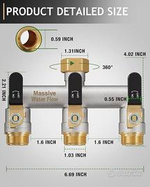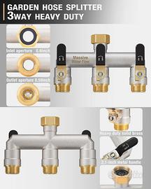 Vendo distributore d’acqua a 3 vie da 3/4", realizzato in metallo massiccio nichelato, pensato per garantire alto flusso e lunga durata. Ideale per collegare più tubi da un unico rubinetto, con valvole indipendenti ON/OFF che permettono di gestire ogni uscita separatamente.
