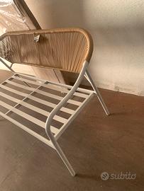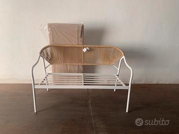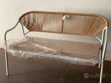 Set da esterno in coordinato nuovo ancora chouso! Comprende salottino con cuscino sfoderabile e con i lacci per bloccarli sulla seduta. Struttura bianca solida in acciaio, schienale in rattan sintetico beige e cuscino in poliestere. Dal design elegante e moderno, senza rinunciare alla comodita’. Tvaolino struttura in acciaio e finta juta e ripiano in vetro trasparente. collezione 2026. Musure L 124 p 62 e h 77. Misure L 88 p 48 e h 40. Consegna a mano, non spedisco.