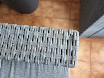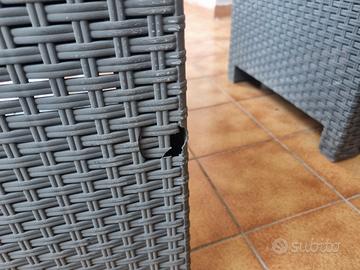 Vendo divanetto, da giardino, 4 pz più cuscini, danneggiato in due punti come si evince dalle foto.