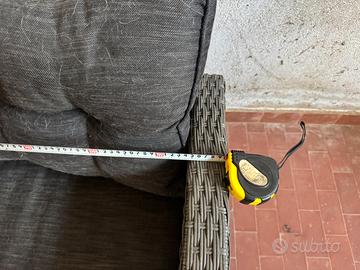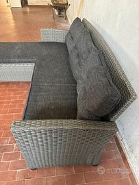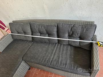Divanetto da giardino a L Il prolungamento puo’ essere messo sia a dx che a sx in quanto componibile. La misura del prolungamento completo è 130 cm. Il divanetto in larghetta misura 170 cm. Completo di cuscini. Ritiro di persona. No spedizione.