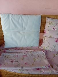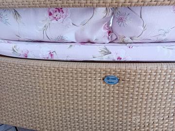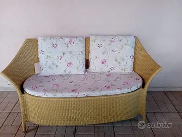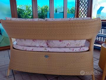 Divanetto per esterno in vimini colore naturale, lunghezza cm 130 , larghezza cm 48. Marchio EMU modello Dafne con cuscino base + 2 cuscini per schienale in colore ecru con rivestimento colore rosa fiorato