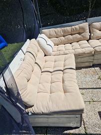 Vendo n.6 cuscini per esterno o interno ideali per divani fatti con bancali epal (come da foto)120x80 ciascuno, con cuscini grigi(seduta + schienale). Vendo solo i cuscini seduta e schienale.