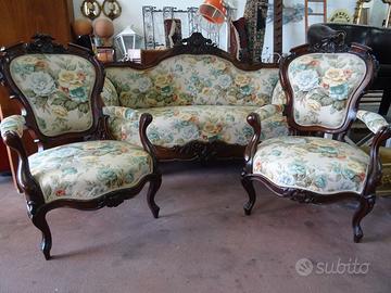 Bellissimo salottino Luigi Filippo restaurato con tappezzeria perfetta,composto da divanetto a barca più due poltrone .
