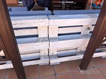 Divano costituito da 12 pallet epal verniciati di bianco completi di piedini. Cuscini compresi da rifoderare per usura tela. Già disponibile piano strada smontato. Da ritirare entro Natale