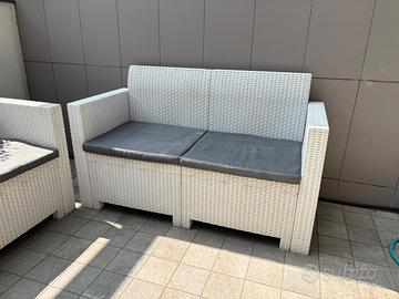 Set da esterno composto da due divanetti in rattan bianco con cuscini grigi. - Struttura in rattan resistente. - Cuscini sfoderabili inclusi. - Design moderno e versatile. Misure nelle foto allegate.