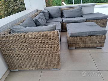 Divano angolare in rattan componibile. composizione attuale cm 248x235 profondità 83 cm. Piedini in alluminio. Pouf 73x73. Composto da n.3 moduli + 2 da 73 cm. Cuscini sfoderabili, da rifare come da foto. Ritiro in loco.
