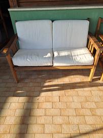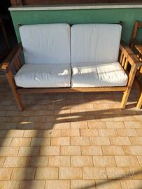 Divano in legno Iroko da esterno con due cuscini di Arredamento Italia misure: lunghezza 134 larghezza 56 altezza 82 altezza seduta 32