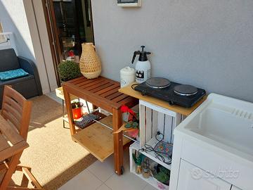 sedie, poltrone, poltroncine, divanetti da balcone o giardino. Acquistate da leroy merlin. Materiale in plastica rigida. A corredo anche tavolo basso contenitore.