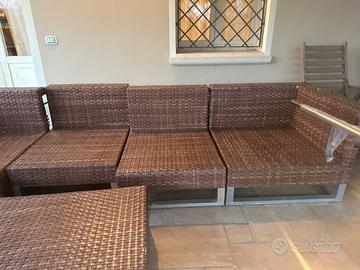 Divano in rattan molto grande senza cuscini un po rovinato in alcuni angoli pidi in alluminio molto keggero completo di tavolino ha due sngolari da poter sistemare come uni vuole .consiglio di ritirarli direttamente in loco no spediziine