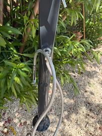 Una moderna doccia da giardino realizzata in polietilene con miscelatore, doccetta lavapiedi, ampio soffione da 250 mm