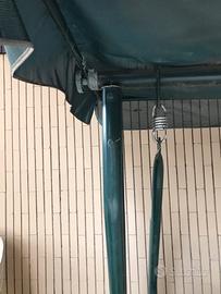 Struttura del dondolo in perfette condizioni ma si è staccata l’asta della copertura, come da foto(attualmente è legata al dondolo con un filo di ferro. Cuscini in discrete condizioni. Ritiro a carico dell’acquirente