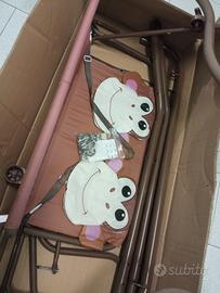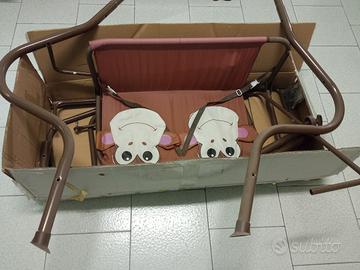 Dondolo altalena per bambini da giardino o esterno in tessuto Oxford marrone con loghi scimmiette struttura in acciaio da due posti con parasole. Pari al nuovo solo montata e subito riposta nella sua scatola originale per mancanza di adeguato spazio. Misure 115 x 75 x 110.