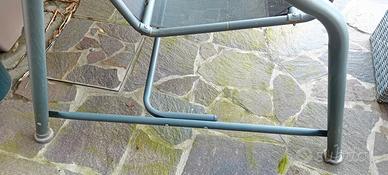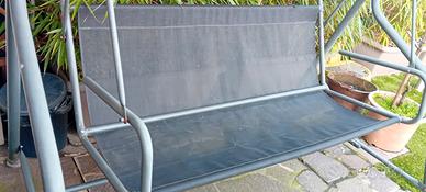 vendo dondolo da giardino, 3 posti, struttura in metallo molto resistente e stabile, smontabile, colore grigio antracite, piedini antiscivolo in plastica, sottoseduta in tessuto sintetico rigido e resistente, cuscino con imbottitura su schienale e seduta, capottina ombreggiante con struttura perimetrale in metallo, tessuto color avorio. misure larghezza 190cm profondità 120cm. Prezzo € 100 trattabili