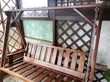 Vendesi dondolo artigianale nuovo in legno massello impregnato color noce. Le misure sono: L 158cm - H 162cm - P 102cm.