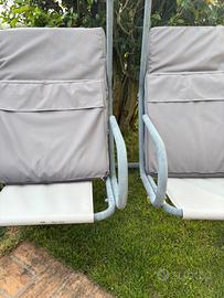 SUPER AFFARE!! Vendo comodissimo dondolo da giardino con doppia seduta monoposto. Dotato di cuscini nuovi e sfoderabili per il lavaggio. Dotato anche di eventuale tettuccio per entrambe le sedute (da montare). In buonissime condizioni, soltanto un po’ scolorito dal sole. MISURE: larghezza ca. 170 cm/altezza 168 cm. Possibilità di smontaggio.