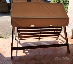 Dondolo rustico in legno, con tetto parasole (plastificato) ottimo in caso di pioggia , n. 3 posti. Tetto color panna, misure seduta 42cm, schienale 70cm, lunghezza seduta 150cm.altezza totale 160cm x lunghezza 150cm. Usato pochissimo. I CUSCINI E il RITIRO a carico dell acquirente