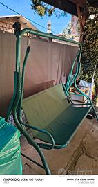 Dondolo per giardino perfettamente funzionante e smontabile completo di cuscini a righe bianche e verdi e tettuccio parasole come foto da immagine campione