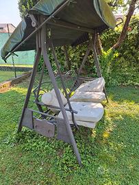 dondolo tre posti, seduta lunga 150cm, lunghezza totale due metri, cuscini e tettuccio da pulire o sostituire.