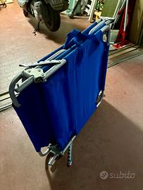 Due lettini pieghevoli e con maniglie per il trasporto da campeggio mare giardino. Sono leggeri da trasportare la struttura è in alluminio.Non sono mai stati usati. Sono stati tenuti in garage con un telo sopra. Necessitano quindi di una pulizia prima dell’uso. Solo ritiro a Sesto Fiorentino. Dieci euro tutti e due o 6 euro uno solo.