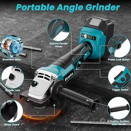 Ecarke Smerigliatrice angolare a batteria, 900W brushless, compatibile con batterie Ma-kita 18V, 9000 giri/min, disco 12,5 cm, chiave inclusa (senza batteria e caricatore).