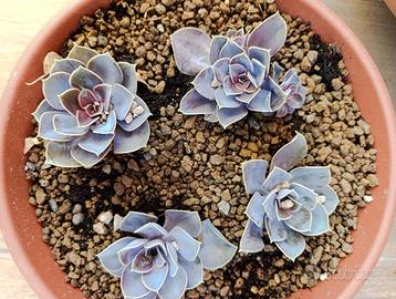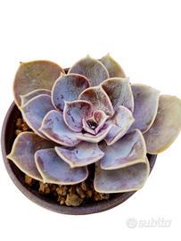 La pianta di Echeveria “Perla di Norimberga” è una succulenta proveniente dall’America centrale e dal Messico, che sviluppa foglie piatte e carnose disposte a rosetta, di colore grigio-azzurro, con riflessi rosa. I fusti si ramificano producendo nuove piantine che possono essere staccate dalla pianta madre. Genera fiori campanulati rossi a margine giallo. Predilige un terreno ben drenato e posizionata in casa va esposta in piena luce, mentre all’aperto ama l’aria fresca dell’estate. Mai bagnare le foglie per evitare ristagni d’acqua.