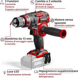 Power X-Change - Il trapano a percussione a batteria Einhell Professional TP-CD 18/80 Li-i BL fa parte della famiglia Power X-Change in cui batterie e caricabatterie sono liberamente intercambiabili. PurePOWER brushless – Il potente motore brushless con scarsa manutenzione garantisce massime prestazioni con autonomia superiore. Dopo la registrazione, il motore è coperto da garanzia per 10 anni. Perforazione a percussione – Avvita, perfora e con la funzione a percussione consente di lavorare su pietra e muratura. L'impugnatura supplementare tutela le articolazioni dell'operatore.