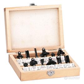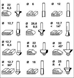 Set 12 frese per fresatrice verticale Einhell compatibile con tutte le frese verticali con attacco diametro 8mm.ntaglio Ø mm 6 (1 pz), mm 12 (1 pz), mm 12,7 (4 pz), mm 16 (1 pz), mm 22 (2 pz), mm 25 (1 pz), mm 28,6 (1 pz), mm 32 (1 pz). Con riporto in widia, indicate per uso con fresatrici verticali.