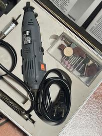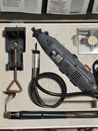 Pratico elettro utensile della marca Kinzo per accurati lavori di precisione, completo di prolunga, supporto per il fissaggio al tavolo e braccio estensibile.