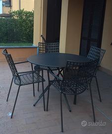 Tavolo rotondo e 4 sedie a poltroncina con rispettivi cuscini color ecrù, tutto marchio EMU. Struttura solida e resistente in acciaio verniciato marrone. Perfetto per terrazzo o giardino.