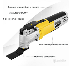 【Contenuto della Confezione】1 x multiutensile oscillante da 300W, 2 x lame semicircolari in plastica/legno, 4 x lame in plastica/legno, 1 x raschietto duro, 1 x piastra di levigatura triangolare, 20 x carta vetrata (5 di P60 / 5 di P80 / 10 di P120), 1 x borsa per il trasporto, 1 x manuale utente.