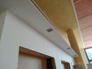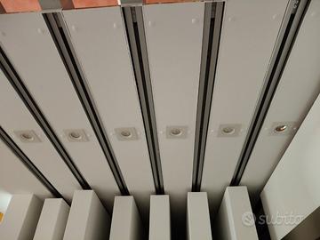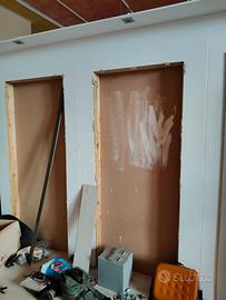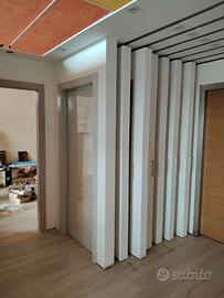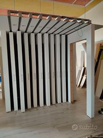Espositore per porte interne o serramenti di vario tipo, misure circa 260x260x260 ( su richiesta misure dettagliate ). Può ospitare fino a 14 porte, di cui 10 su struttura scorrevole. Autoportante previo fissaggio al soffitto della parte piò sporgente. Ha 10 guide superiori a scomparsa di forte spessore con carrelli con fine corsa smorzato. La struttura è uno scatolato in legno e mdf, già verniciato bianco. Completa di faretti ad incasso con lampade led con luce naturale. La struttura ora è smontata ed è sistemata su un bancale in legno dalle dimensioni di circa 300 x 140 x 260. Il tutto si trova a Lanusei, provincia di Nuoro. Per organizzare il trasporto fuori dall'isola necessita sicuramente di un mezzo dalle dimensioni adeguate. Sono disponibili n. 2 strutture. Se interessati ad entrambe si può concordare il prezzo totale.