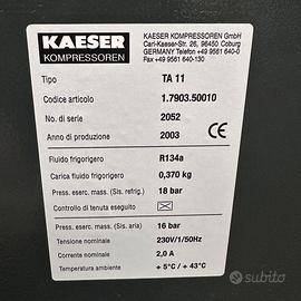 Essiccatore per compressori mod. Kaeser TA 11 PORTATA: 1,25 m3/min PRESSIONE: 18 bar ALIMENTAZIONE: 230V/1/50Hz TIPO DI GAS: R 134 a TEMPERATURA MASSIMA AMBIENTE: +43°C DIMENSIONI: 490 x 630 x 727 mm PESO: 85 kg ANNO: 2003