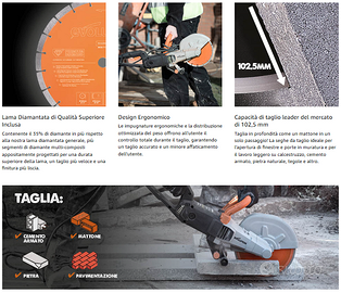 MarchioEvolution Power Tools ColoreArancione E Grigio StileTaglierina elettrica Peso articolo7,3 Chilogrammi UPC849713087300 Informazioni su questo articolo Capacità di taglio maggiore - È possibile tagliare un mattone in una sola volta grazie alla lama di alta qualità da 255 mm fornita in dotazione Il potente motore elettrico delle seghe a disco semplifica qualunque tipo di intervento sulla muratura, incluso su cemento armato. La posizione centrale consente un centro di gravità equilibrato. Più economica - Niente carburante o batterie costosi, niente olio e assistenza Il paramotore rinforzato consente di fare scendere in tutta tranquillità la sega su qualunque superficie. L'angolo sollevato mantiene alzata la lama dal suolo, in maniera tale che sia possibile posarla appena terminato il taglio. Durante l'utilizzo della sega da cemento, l'ampia protezione fissa della lama protegge l'utente dai detriti volanti e migliora la raccolta e il contenimento della polvere Niente fumi nocivi - Ciò rende la troncatrice a mola R255DCT sicura per l'uso in qualunque ambiente Fornita in dotazione con la lama diamantata Evolution di alta qualità con il 35% in più di diamante e con profilo di taglio multi-composito. Progettata per tagli più rapidi, più netti e per durare di più