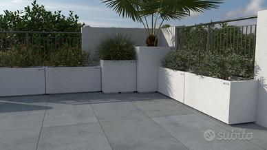 fabbrica fioriere in cemento e graniglia bianca e polvere di marmo a doppio strato di opportuno spessore con rete in ferro tra i due strati di cemento e un mix di fibre .