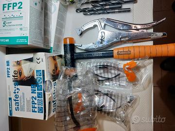 Valigetta , Mazzuola Beta 1392/35 anti rimbalzo ottima pinza a scatto beta 1051gm regolabile , mascherine, occhiali antinfortunistica, tappi anti rumore cassetta pronto soccorso punte da trapano. vendita in blocco.