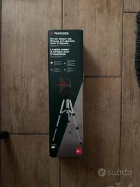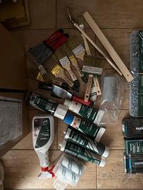 Materiale per pitturare , una livella laser con piede, un set per lucidatura e utensileria varia per fai da te in casa.