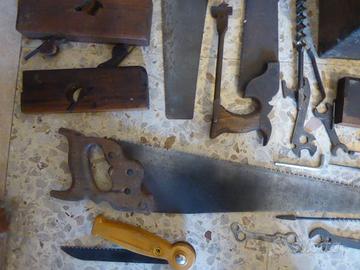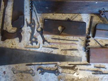 una bellissima falegnameria di una volta tutti gli attrezzi stanno nella grande cassa, seghe, pialle, trapano , punte da legno, livella , seghetto, sega, piallatrice, ecc...