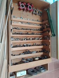 Cavatrice € 1500, levigatrice a disco + toupie € 500 (no trascinatore), aspiratore € 700, attrezzature varie, ferramenta da falegname, legnami, tranciati e pannelli rivestiti. Funzionanti sul posto. Lentate s/S (MB)