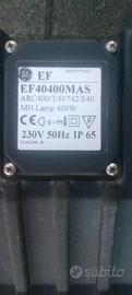 Vendo due fari industriali, modello EF40400MAS marca GE (General Electric), ideale per illuminazione esterna o ambienti industriali. 🔧 Caratteristiche: Lampada MH (ioduri metallici) da 400W Attacco E40 Alimentazione: 230V – 50Hz Grado di protezione IP65 (resistente a polvere e acqua) Struttura robusta, adatta per uso esterno. Perfetto per capannoni, cortili, piazzali, officine o illuminazione di grandi spazi. Condizioni più che buone.