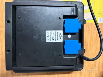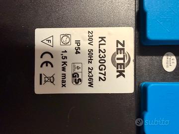 Faro da lavoro con prese emergenza integrate Testato e funzionante Alimentazione: 230V * Lampade: 2x36W (tubi fluorescenti) * Potenza max supportata: 1,5 kW * Protezione: IP54 (resiste a polvere e spruzzi) * 2 prese elettriche integrate (quelle blu dietro)